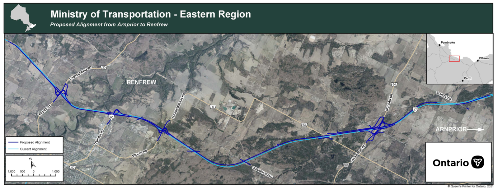 Map showing the proposed alignment and interchanges of the future widened Highway 17 between Arnprior and Renfrew